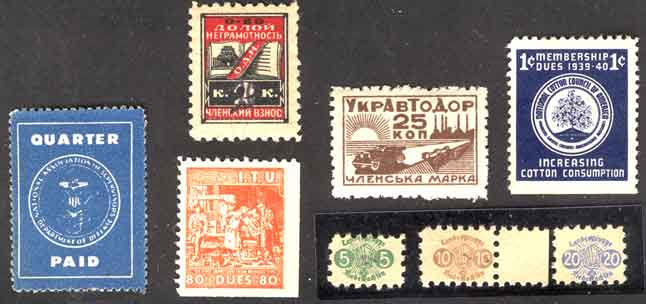 DUES STAMP: A stamp that indicates membership dues (for a club, trade union, organization etc.) have been paid. Also